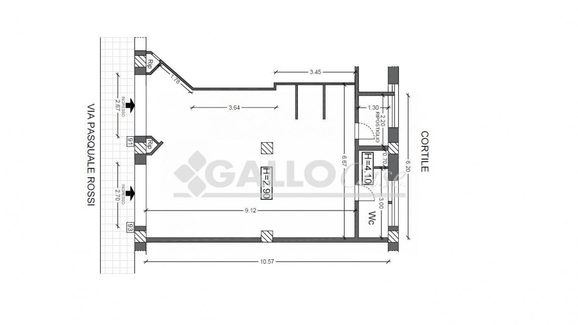 Negozio con due aperture fronte strada oltre finestre retrostanti. L’unità è composta da un unico ambiente con ripostiglio e bagno.