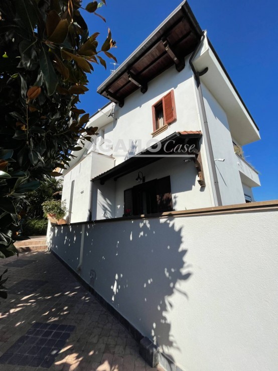 In posizione molto panoramica, dotata di meravigliosa vista sul centro città, elegante porzione di villa bifamiliare di totali mq 477 lordi circa posta su complessivi quattro livelli e composta da: PIANO SEMINTERRATO con ampio portico che da accesso alla tavernetta, composta da un unico ambiente comodo con camino ed angolo cottura a vista, bagno e due comodi ripostigli; PIANO TERRA con ingresso principale su ampio salone, cappottiera, cucina, bagno e balconi a livello; PIANO PRIMO con ampio studio a vista (separabile), camera matrimoniale con accesso dalla cabina armadi e dotata di bagno, ulteriori due camere, bagno e balconi; PIANO MANSARDA open space con bagno e locali bassi adibiti a soffitta.
